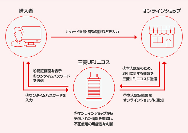 - 三菱UFJニコスは、本人認証の際に対象のオンラインショップから送信されるお客さまの個人情報(取り引きの際に使用した機器に関する情報、購入画面等に入力した情報、利用加盟店におけるお客さま情報等)につきましては、対象のオンラインショップがお客さまご同意の下、ご本人に代わって提供しているものとして取り扱います。なお、海外のオンラインショップにおきましても、国内のオンラインショップと同様の取り扱いといたします。
