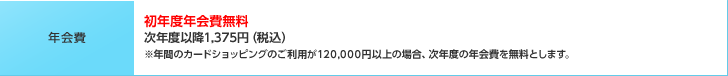 オートチャージ・クイックチャージをはじめショッピングやお食事などのお支払いを含めたご利用金額が、年間120,000円以上の場合、翌年の年会費も無料とします。
