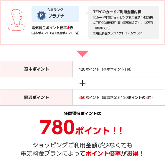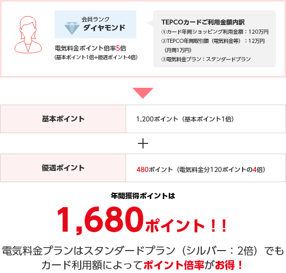 また、カード年間ショッピング利用額、またはTEPCO年間取引額、ご加入の電気料金プランによって会員ランクを判定し、電気料金お支払い分のポイントが最大5倍になります。