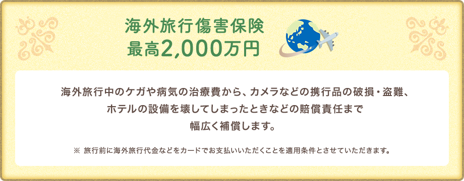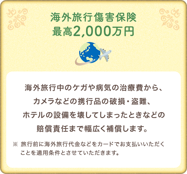 最高2,000万円 ご入会日以降(当日を含む)に出発される海外旅行に海外旅行傷害保険を付帯します。