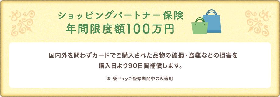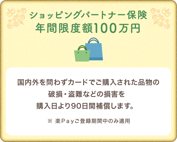 年間限度額100万円 国内外を問わずカードでご購入された品物の破損・盗難などの損害を購入日より90日間補償します。