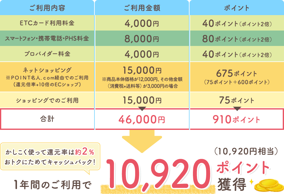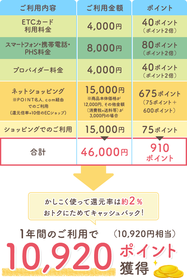 毎日のお買い物から、ETCカード、携帯電話、ネットショッピングなどにお使いいただくと1年間で10,920円もキャッシュバックされます!