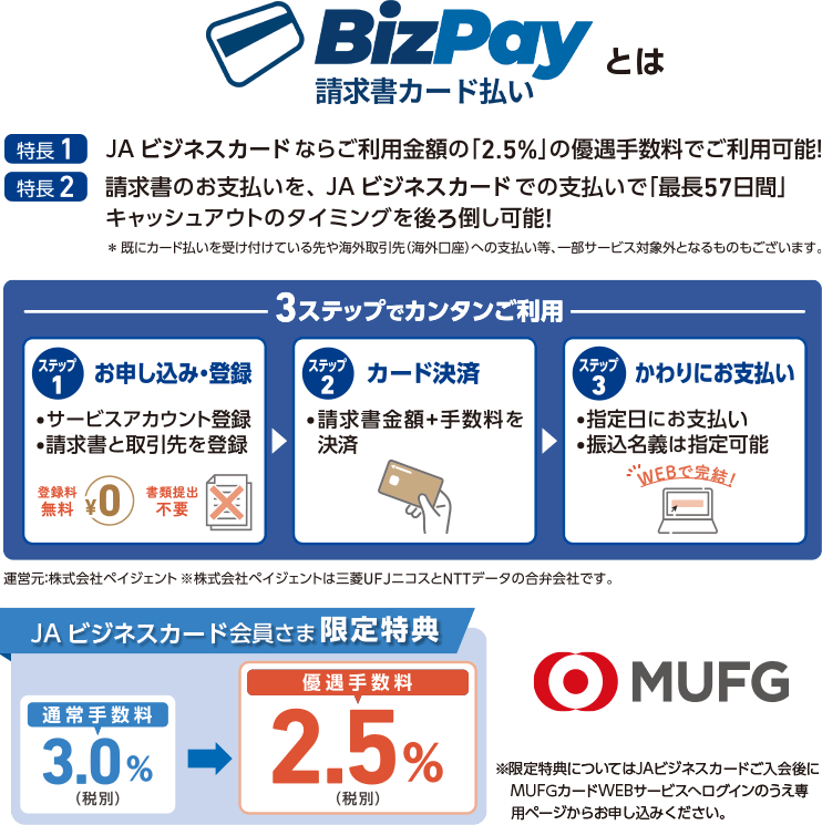 本特典はJAビジネスカード限定の特典となります。JAコーポレートカード、JAカード(一体型・単機能型)には適用されません。また、JAカード(一体型・単機能型)のご入会特典、ご利用特典(JA直売所・ファーマーズマーケットでのご利用分のご請求時5%割引、JA-SS・ホクレンSSでのご利用分のご請求時2円/L割引、JAグループ(直売所・給油所を除く)の対象店舗等でのご利用分の+2ポイント還元特典)は適用対象外です。