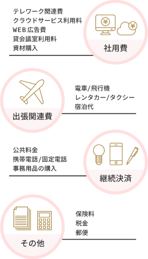 出張費や接待費はもちろん、クラウドサービス利用料やWEB広告費、テレワーク関連費まで、企業のあらゆる経費のお支払いにご利用いただけます。