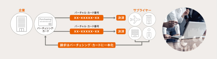 バーチャルカードは、パーチェシング・カードを親番号として企業が発行・管理できるカード番号です。用途に応じて必要なカード番号を発行でき、一つのカード番号毎に企業が利用条件を細かく設定できます。利用分は一括してパーチェシング・カード名義に請求されます。