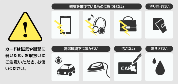 カードの磁気不良や変形により、カードがご利用できないというケースが発生しています。カードは磁気に弱いため、磁石および磁界を発生させる機械等の近くには置かないよう、また無理に曲げたり、高温の環境に放置しないようご注意ください。