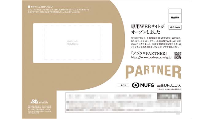 会員情報誌「PARTNER」をお届けする際に使用するラッピングフィルムに、植物由来で環境にやさしい「バイオマスプラスチック」を利用することで、フィルム製造時や廃棄時の温暖化ガスの排出抑制に努めています。