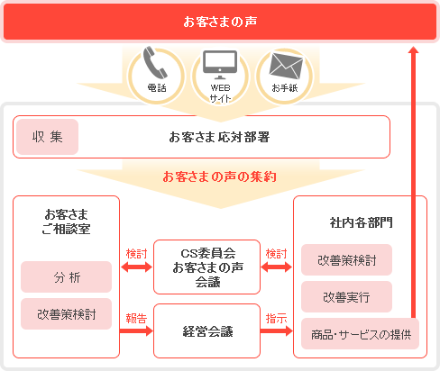 お客さまご相談室及び関係各部参加による、お客さまの声会議を定期的に開催し、お客さまからいただいたご意見・ご要望に対する改善策等を検討しています。