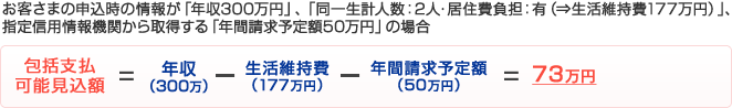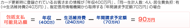 - 「包括支払可能見込額」は、カード更新審査時点において弊社の保有するお客さまの情報(年収、同一生計人数、居住費負担の有無)をもとに算出いたします。