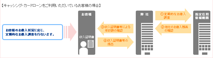 また、お借入残高の合計額が10万円以上のお客様に対しては、貸金業者が加盟する指定信用情報機関が保有する信用情報を使用した定期的なお借入調査が義務付けられ、収入証明書等の提出のお願いや新たなお借入を制限させていただくこととなります。