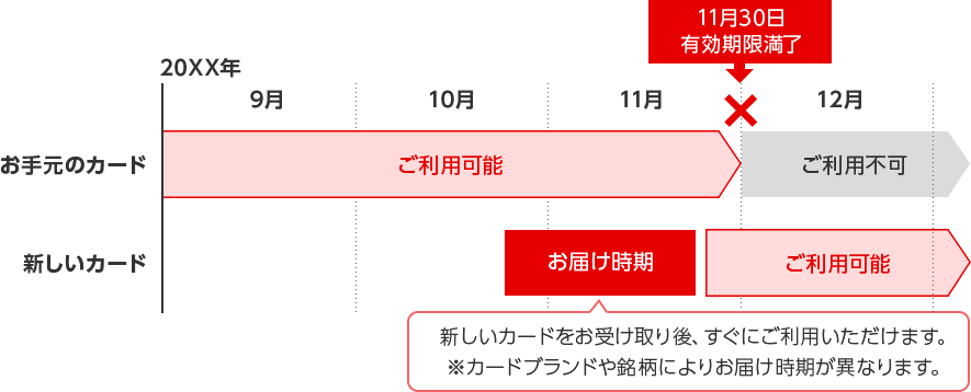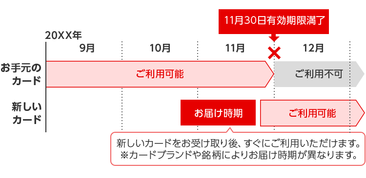各ブランドごとの送付スケジュールや、更新カードお受け取り後にご確認いただく事項などを、以下のリンク先でご案内しています。