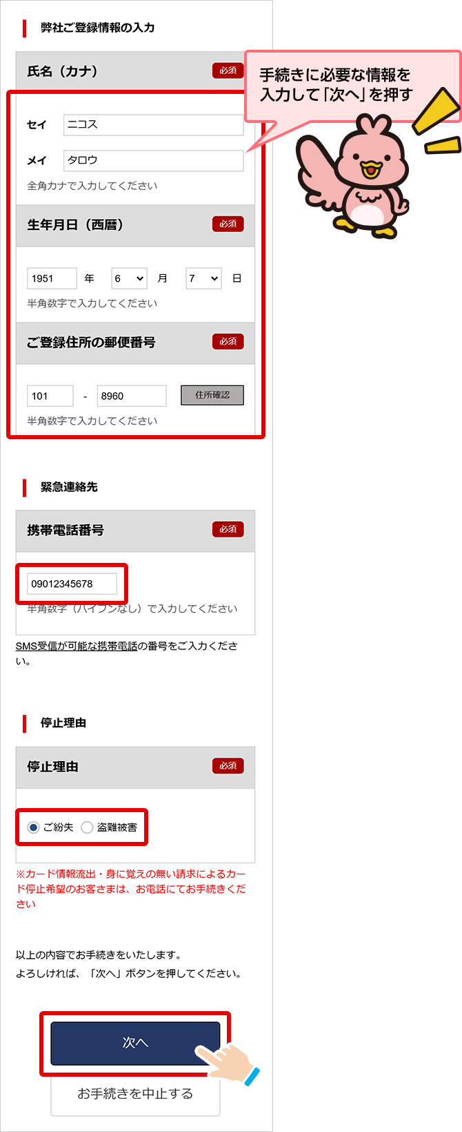ご登録情報の変更がある方や解約をご希望の方は盗難紛失受付センターにお電話ください。 - 2 再発行カードはご登録のご住所へ送付いたします。