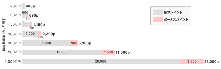 年間のカードショッピングご利用金額の合計が30万円になると、90ポイントをボーナスポイントとして加算、以降ご利用10万円ごとに30ポイントが加算されます。
