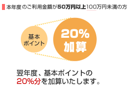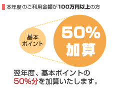 わいわいupは一定額以上のショッピングのご利用で、翌年度の獲得ポイントが最大50%アップする特別なサービスです。本年度(当年2月~翌年1月ご請求分)のショッピングご利用金額に応じてポイント優遇率を決定し、翌年度の獲得ポイントを優遇します。