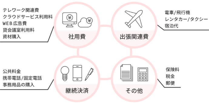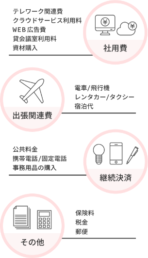出張費や接待費はもちろん、クラウドサービス利用料やWEB広告費、テレワーク関連費まで、企業のあらゆる経費のお支払いにご利用いただけます。