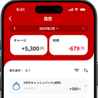 ご利用金額の0.5%分が毎月チャージ残高へキャッシュバックされます。アプリの利用履歴画面より確認が可能です。