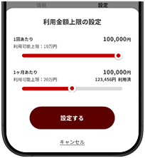 利用金額上限の設定をアプリからカンタンに設定・変更が可能です。また、決済時のプッシュ通知機能もあり、安心・安全にご利用いただけます。