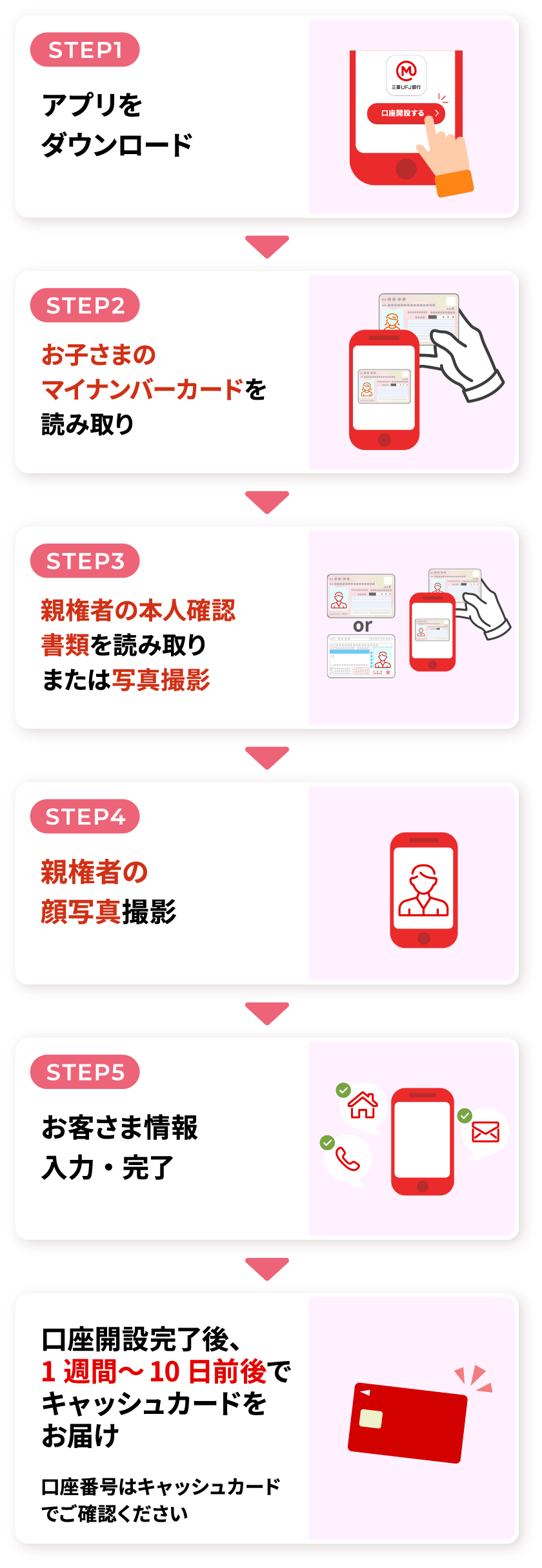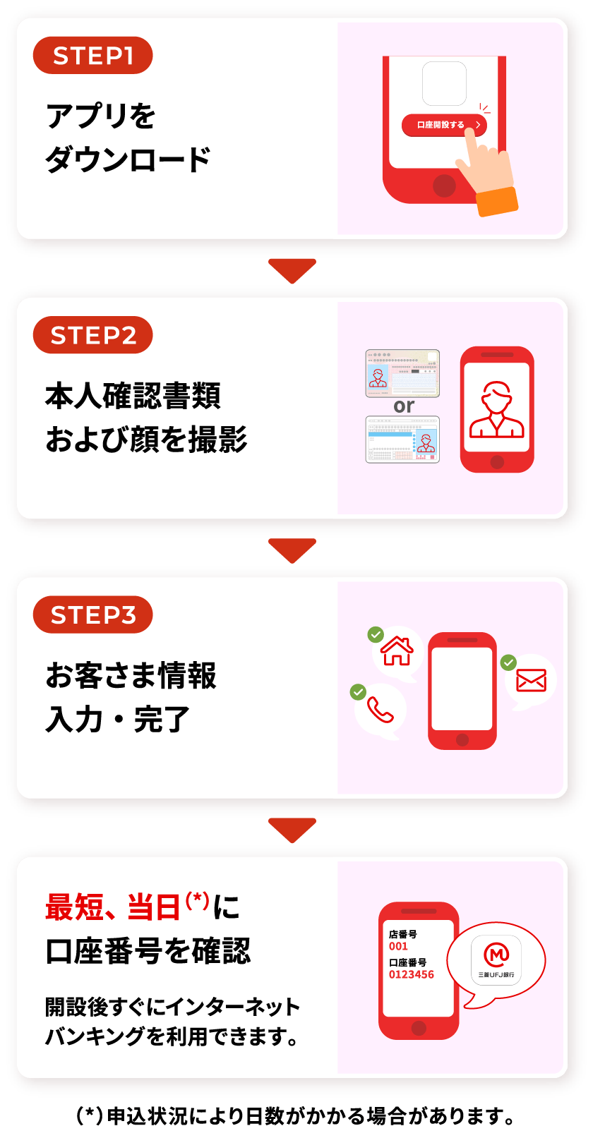 - スマート口座開設アプリまたはMDCアプリ(*1)にて普通預金口座を新規開設(*2)