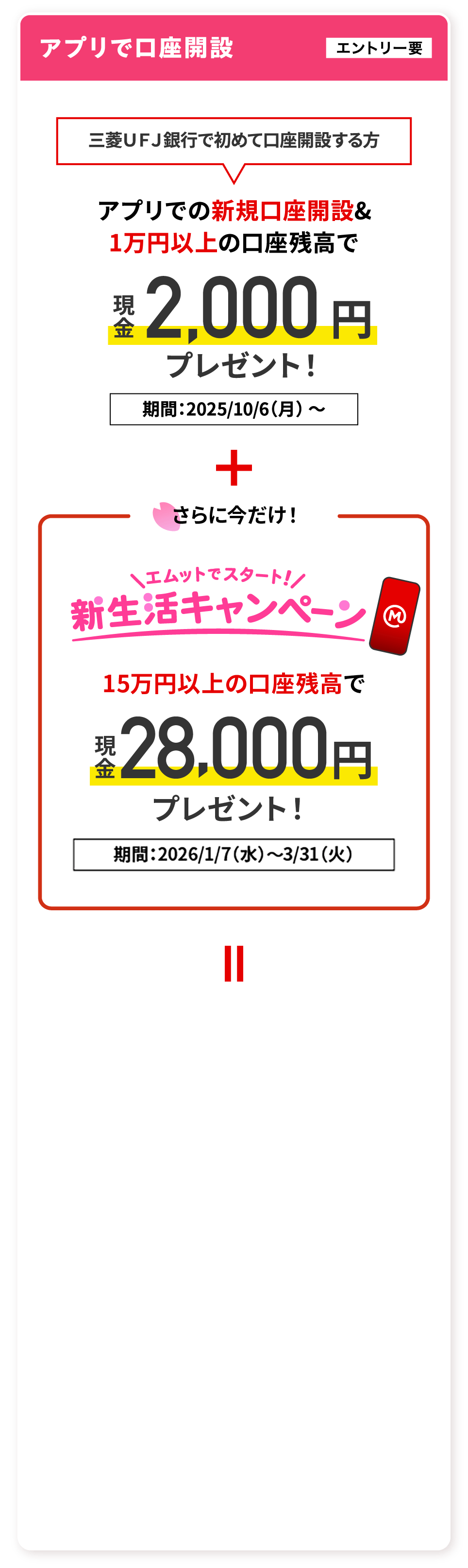 - 「口座開設プラン」および「エムットでスタート!新生活キャンペーン」へのエントリーをもって、株式会社三菱UFJ銀行が定める個人情報の取扱いに関する同意条項に同意したものとみなします。