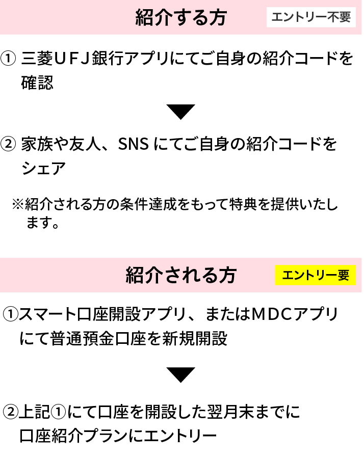 - エントリーの対象口座は、本プラン実施期間中にスマート口座開設アプリ、もしくはMDCアプリで開設された三菱UFJ銀行普通預金口座です。