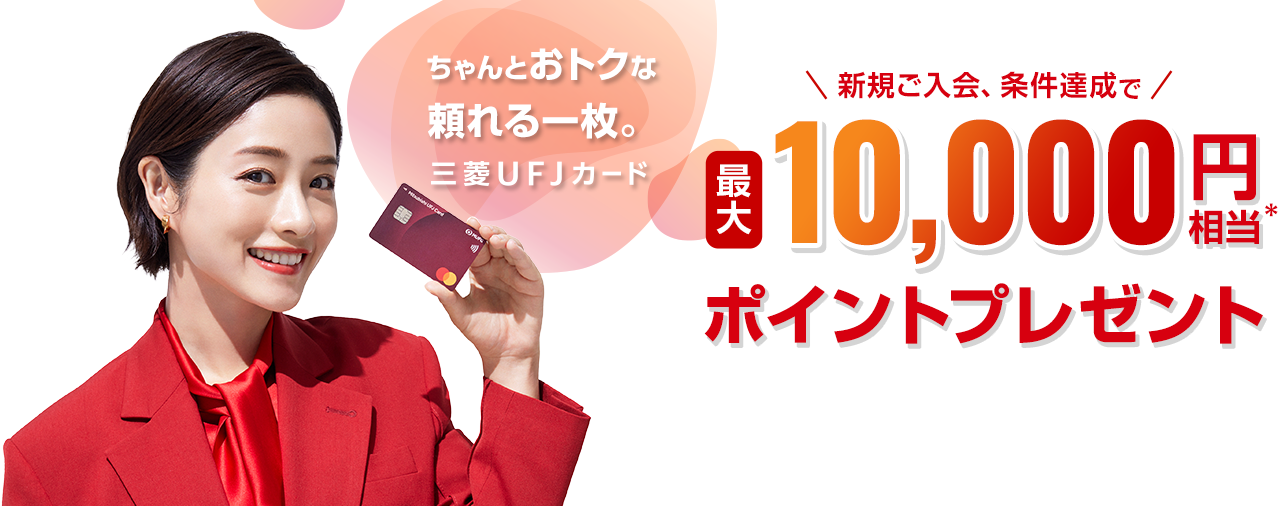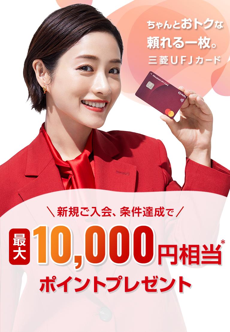 01 ポイントがたまりやすい \三菱UFJ銀行をお支払口座に設定で/ 対象店舗のご利用分が最大20%ポイント還元(*) 要エントリー 01 ポイントがたまりやすい \三菱UFJ銀行をお支払口座に設定で/ 対象店舗のご利用分が最大20%ポイント還元(*) 要エントリー
