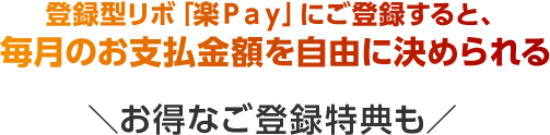2 事前に・あとから調整 登録型リボ「楽Pay」にご登録すると、毎月のお支払金額を自由に決められる! お買い物のときに「分割払い」や「リボ払い」を指定しなくても、1回払いをあとから変更可能! 2 事前に・あとから調整 登録型リボ「楽Pay」にご登録すると、毎月のお支払金額を自由に決められる! お買い物のときに「分割払い」や「リボ払い」を指定しなくても、1回払いをあとから変更可能!