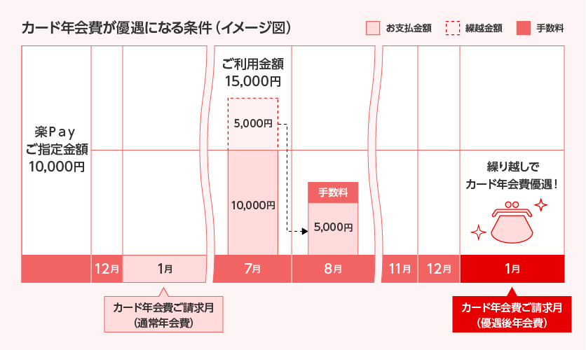 「楽Pay」ご利用分が翌月以降に繰り越されると、次回のカード年会費を優遇いたします。