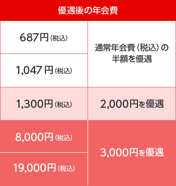 | 3,001円~5,000円 | 通常年会費(税込)から2,000円を優遇 |