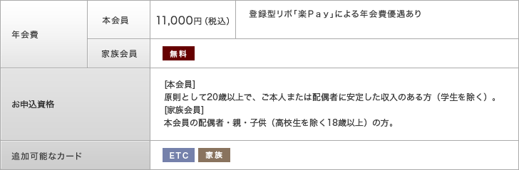 | 年会費 | 本人会員 | 11,000円(税込) 登録型リボ「楽Pay」による年会費優遇あり |