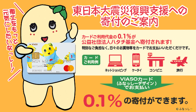 - 国内でのカードショッピングご利用代金の0.1%を当社が公益社団法人ハタチ基金に寄付いたします。寄付金は東日本大震災で被災した子供の支援に活用されます。