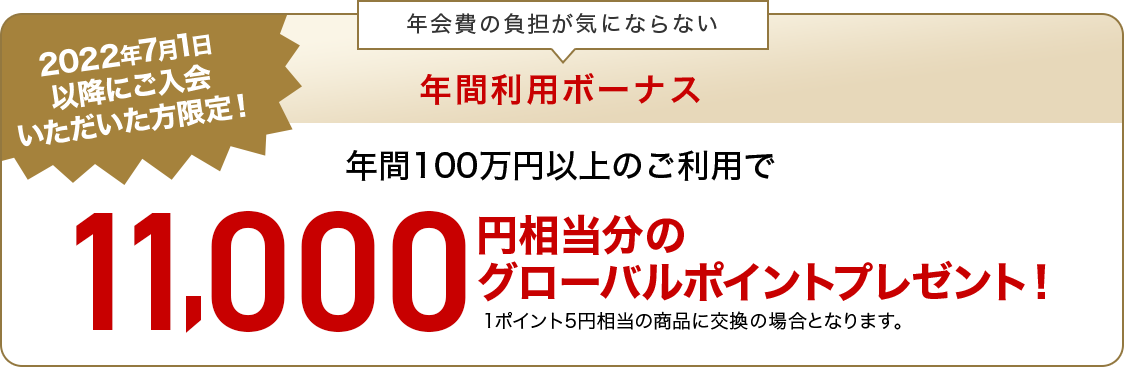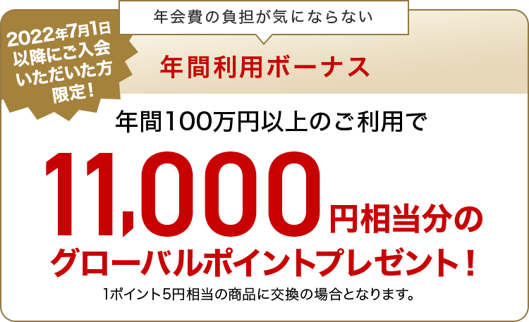 ご入会後、毎年12ヵ月間(初年度は最大13ヵ月間)のショッピングご利用金額を集計し、合計が100万円以上の方に、年間利用ボーナスとして、11,000円相当のグローバルポイント(2,200ポイント)を進呈いたします。