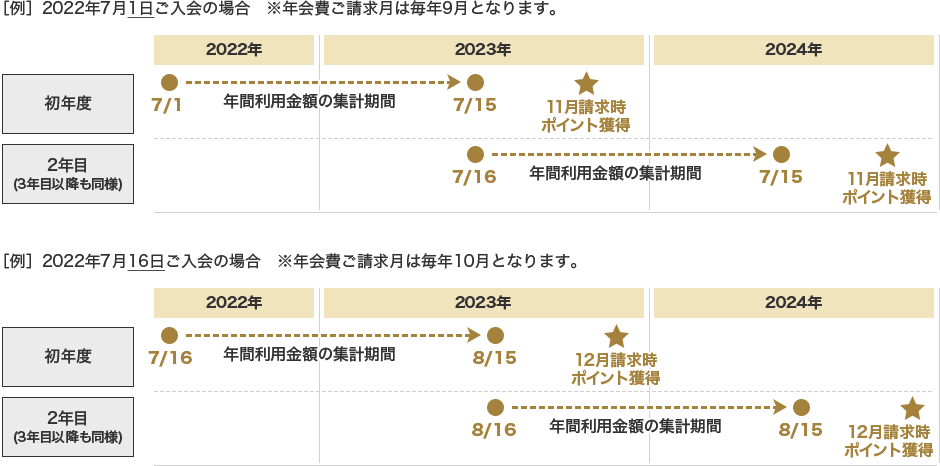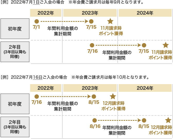 - ご利用いただいた加盟店からの売上票到着が遅れた場合、年間利用金額の集計期間のご利用であっても、集計の対象外となることがありますので、あらかじめご了承ください。