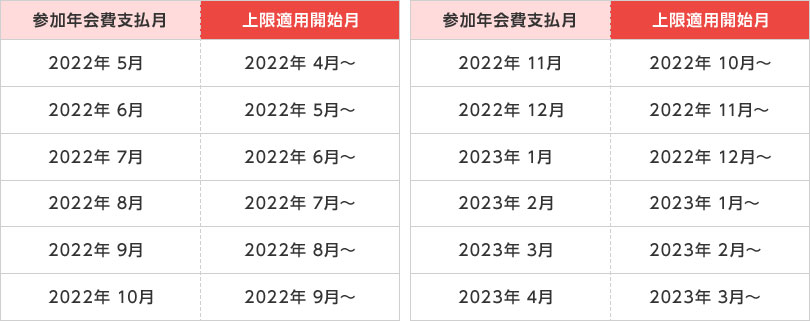 - 会員様ごとの「参加年会費支払月」に応じた、上限適用開始月は下表のとおりです。