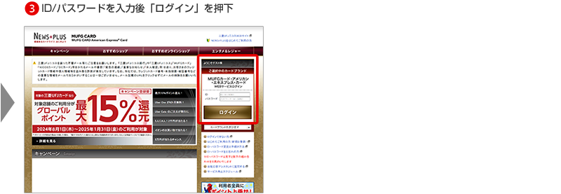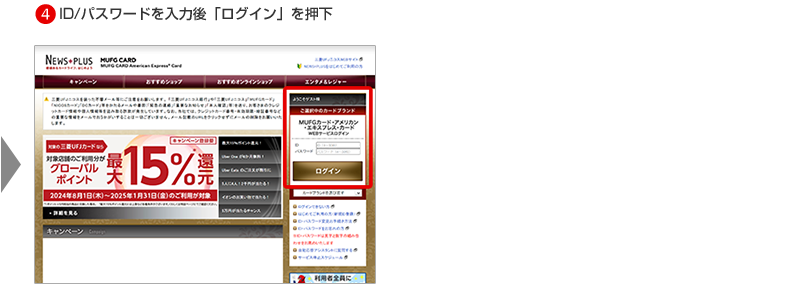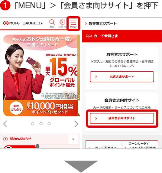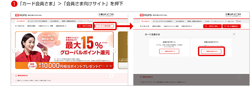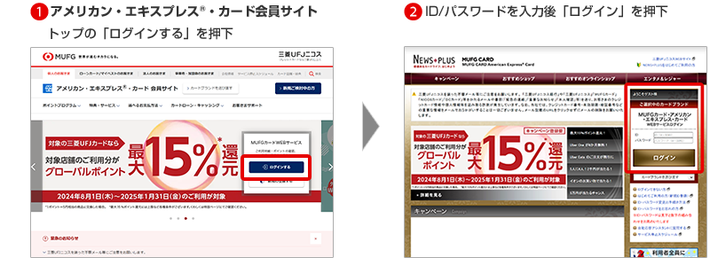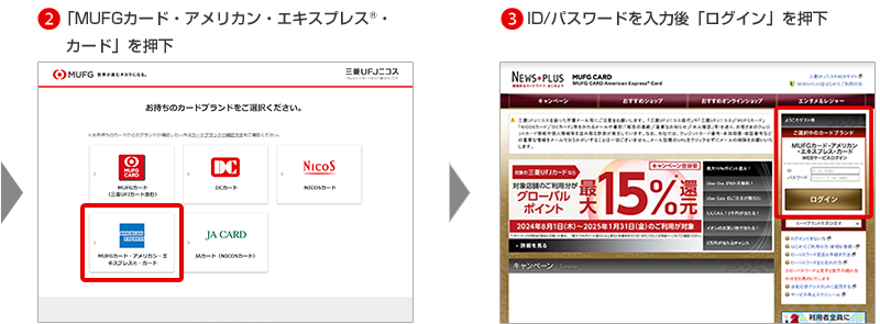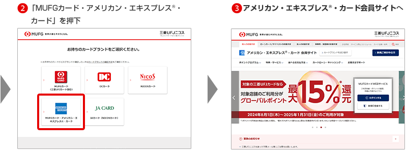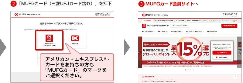 今回のリニューアルでは会員さま向けサイトのうち、「アメリカン・エキスプレス®・カード会員サイト」を「MUFGカード会員サイト」に統合しております。