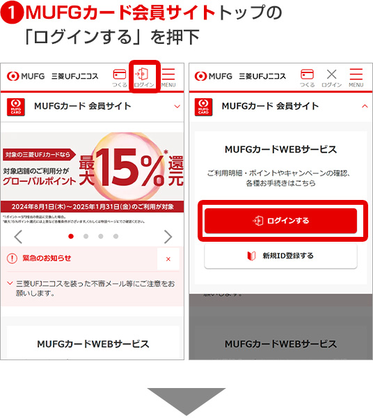 統合により、会員さま向けサイトへのブランド選択画面、MUFGカードWEBサービスログイン時のブランド選択画面において、一部変更がございます。