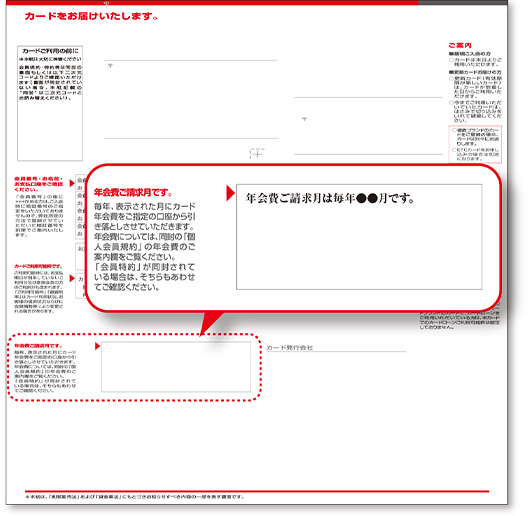 カード送付台紙左下の「年会費ご請求月」欄(下図ご参照)に「年会費ご請求月は毎年●●月です。」と記載がある場合でも、本カードは年会費を頂戴いたしません。