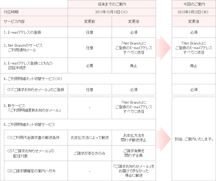 「ご利用明細ネット切替サービス」にご登録いただく際、「ご請求お知らせメール」の登録を希望制としておりましたが、2012年3月22日以降、「ご利用明細ネット切替サービス」にご登録の方は、必須とさせていただきます。