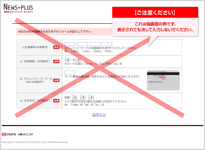 - お客様の入力した情報が悪用される恐れがあります。決して入力しないでください。
