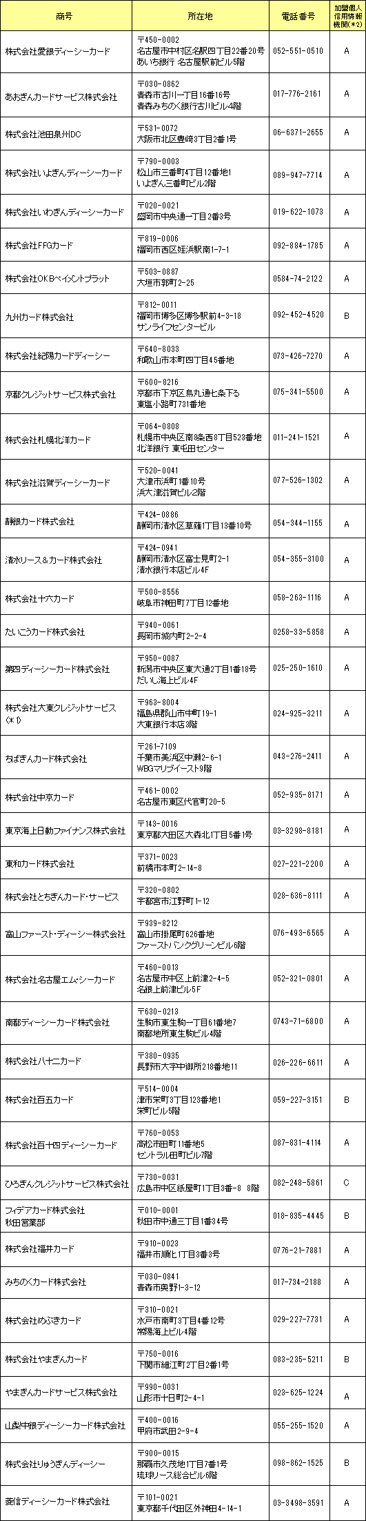 - 当社の提携個人信用情報機関は、以下の各機関のうち、カード発行会社ごとに加盟個人信用情報機関として法人会員規約(コーポレート用・個人決済型)別表1に記載されている者以外の者です。