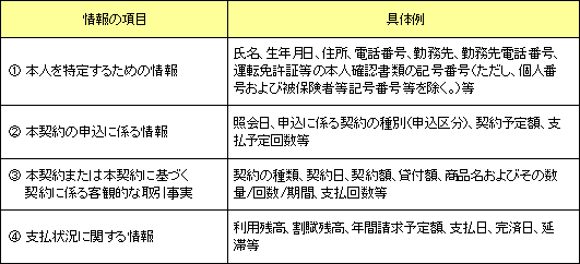 - 会員等は、当社が、本契約に関する客観的な取引事実に基づく会員等に係る下表「登録される情報」欄①②③④記載の個人情報を、加盟個人信用情報機関に提供し、加盟個人信用情報機関が下表に定める期間登録することに同意するものとします。