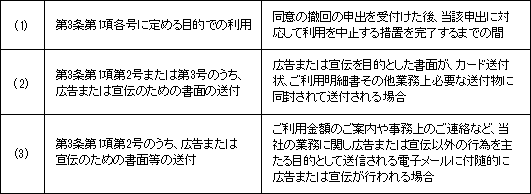 - 当社のクレジット関連事業における広告または宣伝のための書面等の送付および電話等による営業案内
