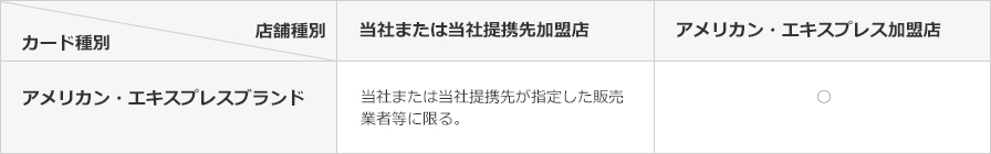| (2) | アメリカン・エキスプレス加盟店 | 加盟店のうち、アメリカン・エキスプレスまたはアメリカン・エキスプレスと提携する者との間で、アメリカン・エキスプレスブランドのカードに係る加盟店契約を締結した者をいいます。 |