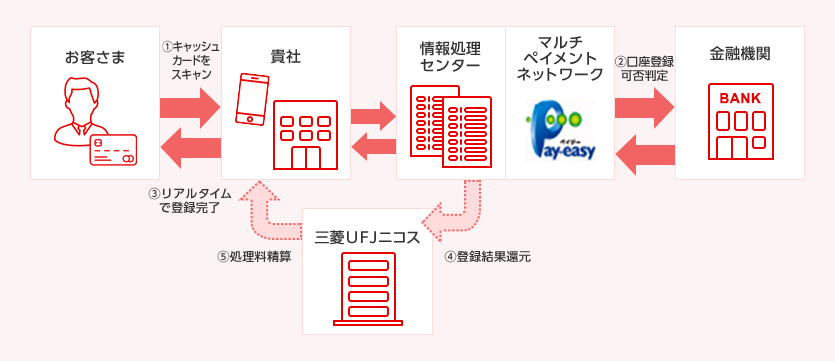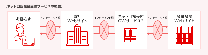 当社が有する国内最大級の金融機関ネットワークを利用し、お客さまご指定口座よりご請求代金を貴社に代わって引き落としいたします。
