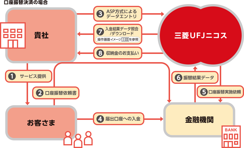 貴社のお客さまへのご請求金を、弊社が提携する全国の金融機関ネットワークを利用し口座振替により貴社に代わって集金するシステムです。口座振替により収納した口座振替金から、事務取扱手数料を差し引き、貴社にお支払いします。