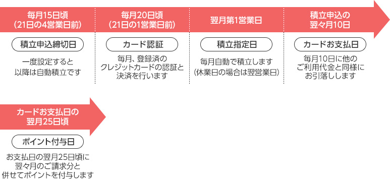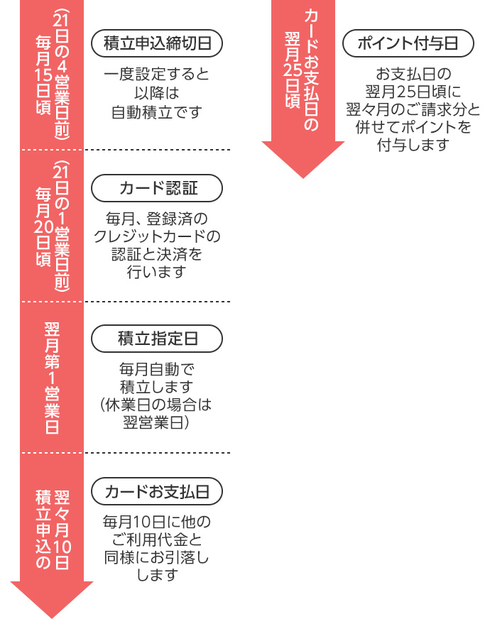 クレジットカードを証券口座にご登録いただくことで、毎月自動的に積立が行われます。