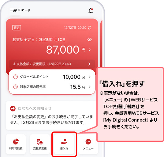アプリ、WEBサービス、お電話からのお申し込みで、お客さまのカードご利用代金お支払口座にご希望の金額をお振り込みするサービスです。ご利用可能枠の範囲内で、繰り返しご利用いただけます。