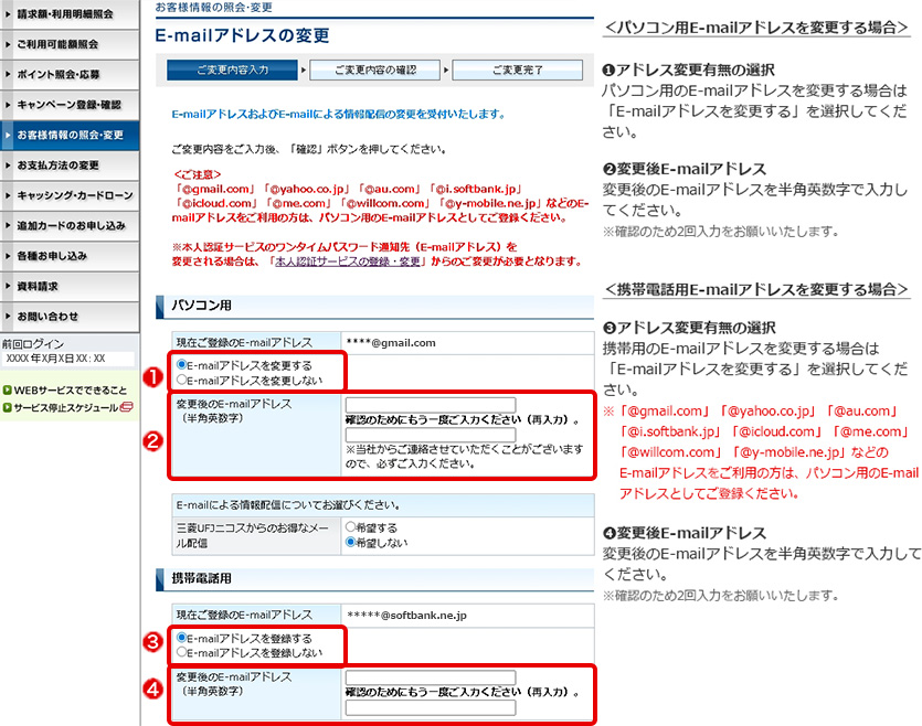 STEP1. 「お客様情報の照会・変更」にて、「E-mailアドレスの変更」を押す