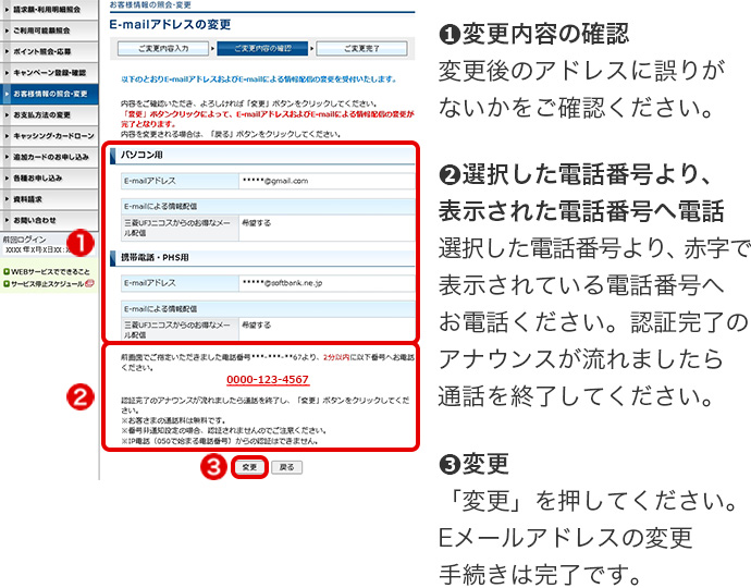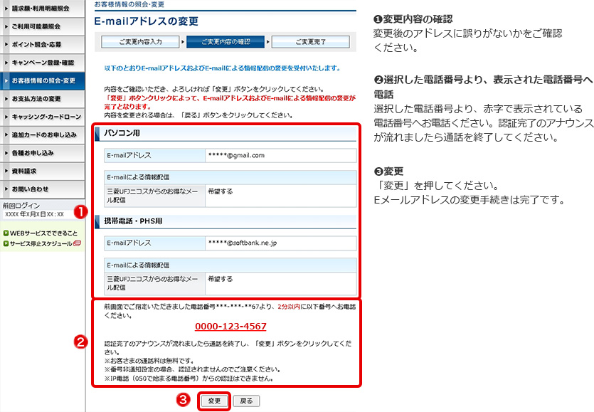 STEP4. 選択した電話番号より、表示された電話番号へお電話後、「変更」を押す