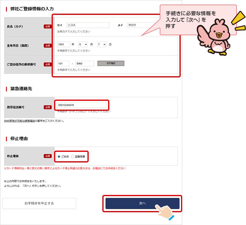 ご登録情報の変更がある方や解約をご希望の方は盗難紛失受付センターにお電話ください。 - 2 再発行カードはご登録のご住所へ送付いたします。