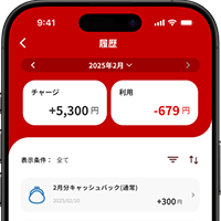 ご利用金額の0.5%分が毎月残高へキャッシュバックされます。アプリの利用履歴画面より確認が可能です。
